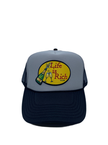Two Toned Black & Grey with Celebration Logo- 5 Panel High Crown Trucker Hat