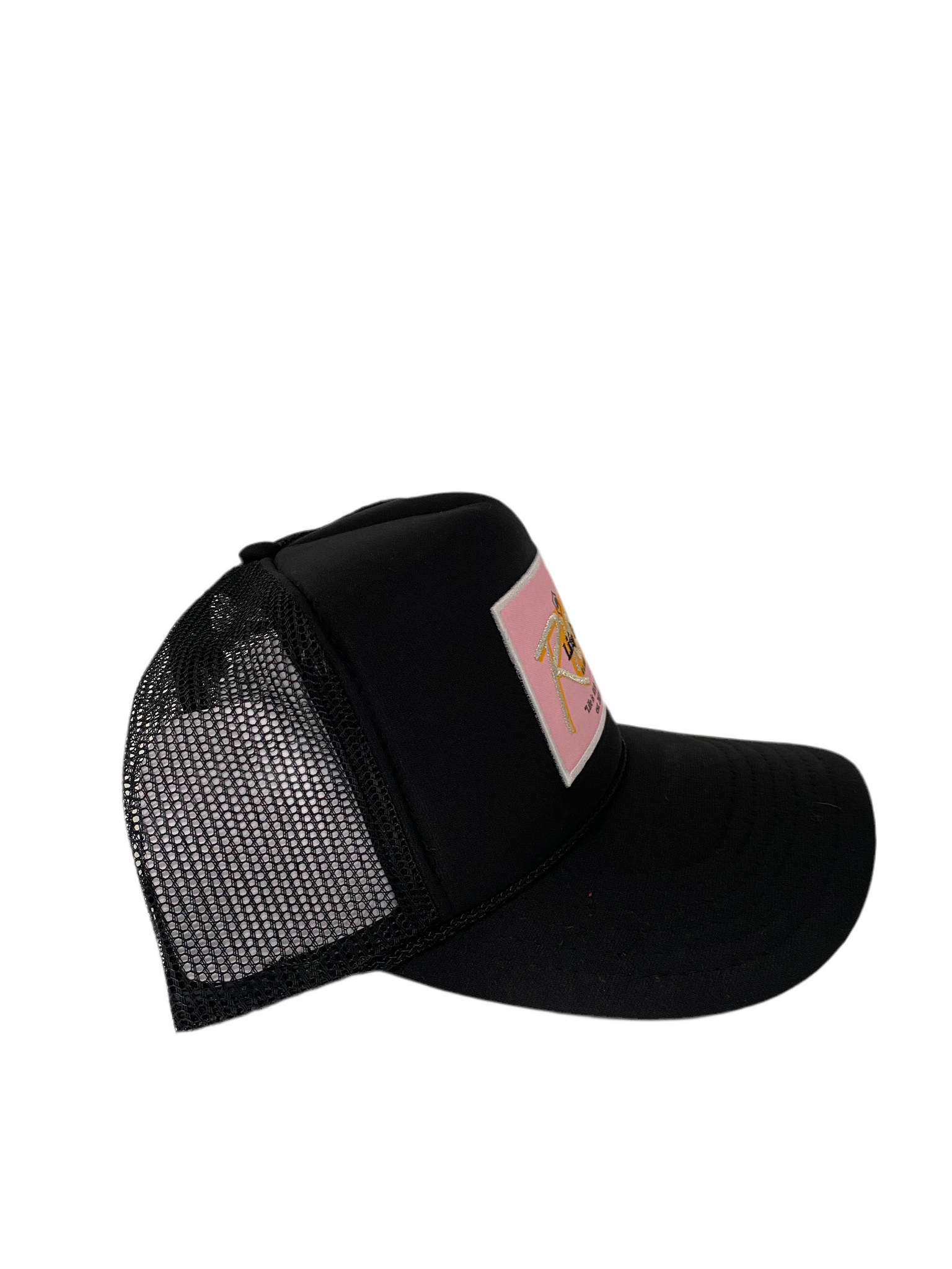 Black with Pink Rich Box Logo- 5 Panel High Crown Trucker Hat