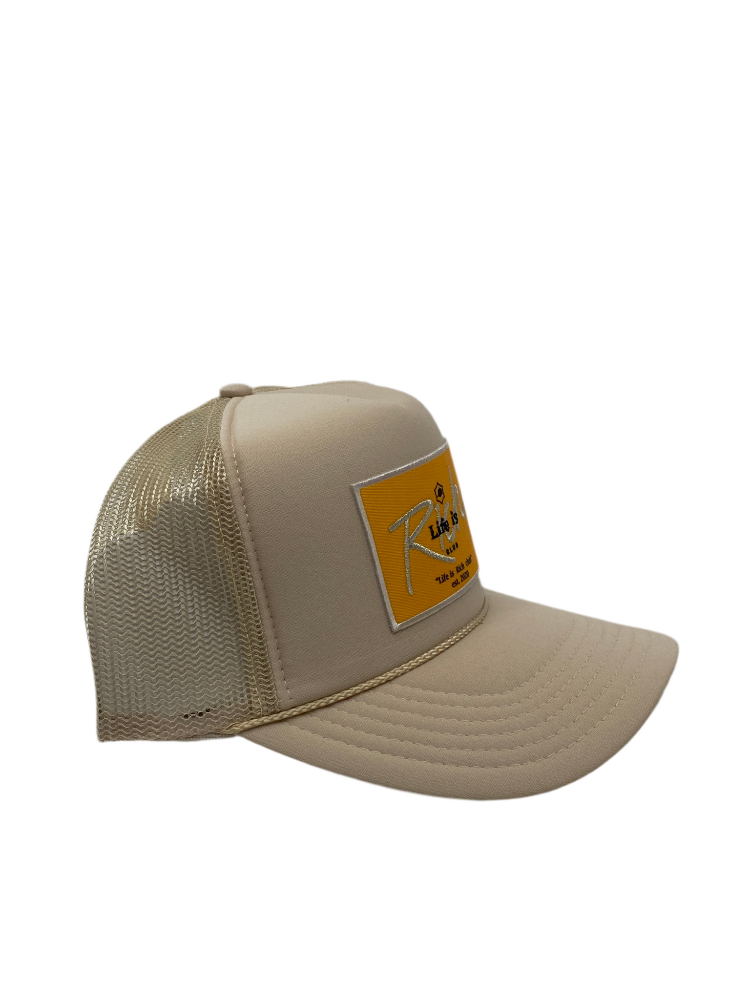 Bone Tan with Gold Rich Box Logo- 5 Panel High Crown Trucker Hat