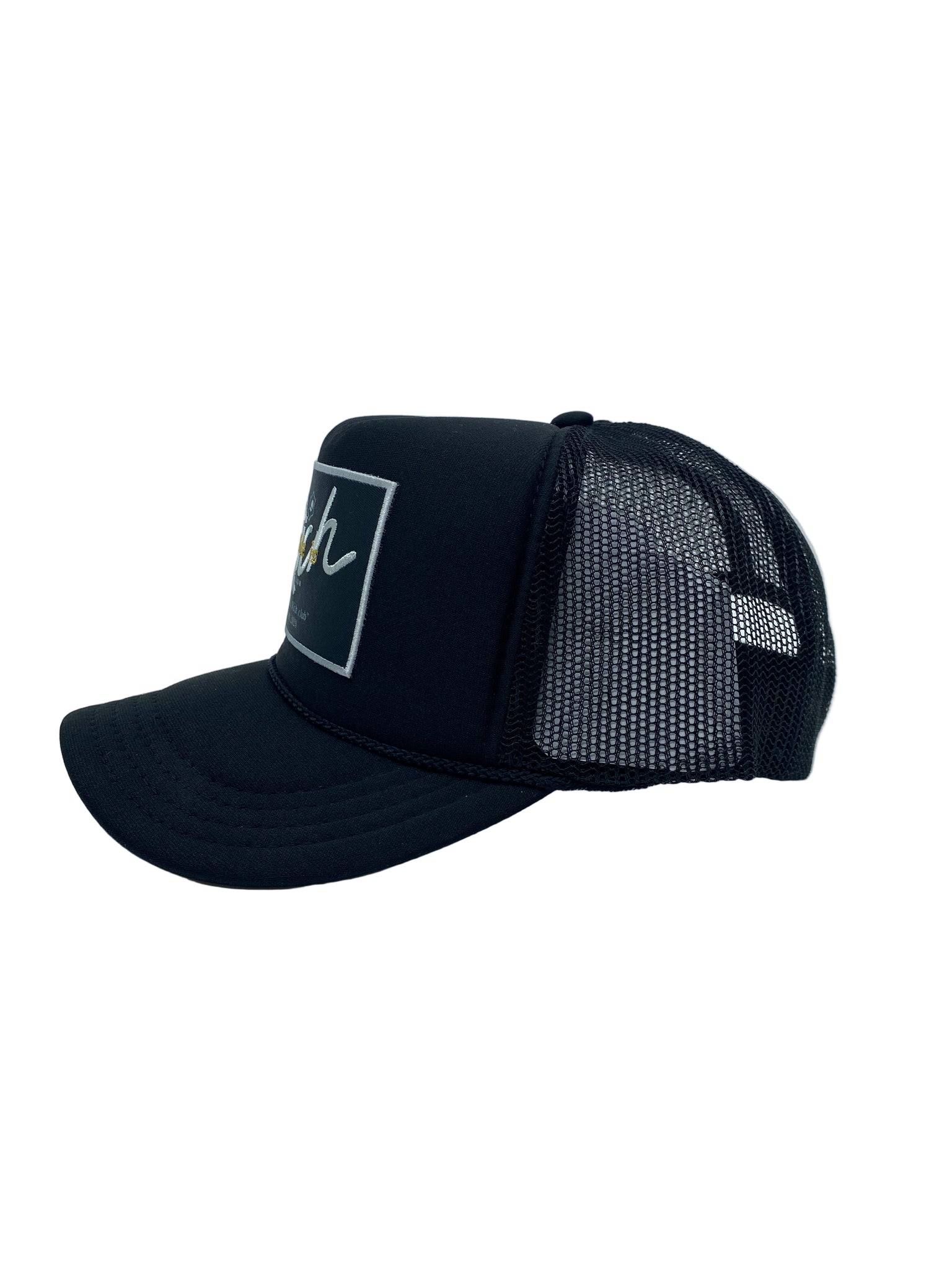 All Black with Black Rich Box logo- 5 Panel High Crown Kids Trucker Hat.