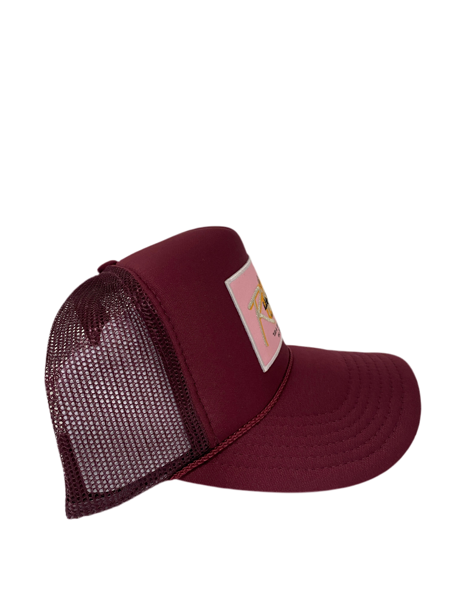 Maroon Wine with Pink Rich Box Logo - 5 Panel High Crown Trucker Hat