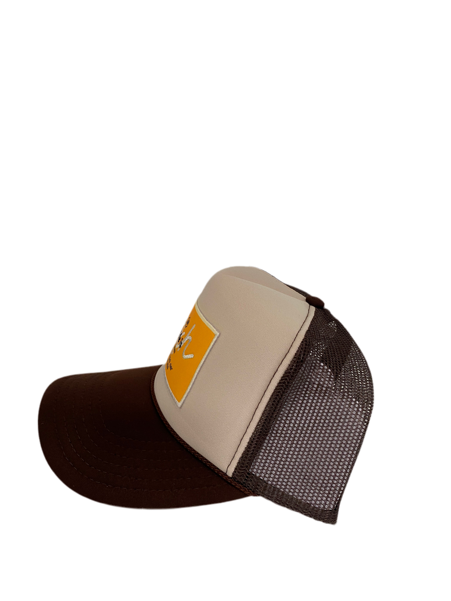 Two Toned Brown & Tan with Gold Rich Box Logo - 5 Panel High Crown Trucker Hat